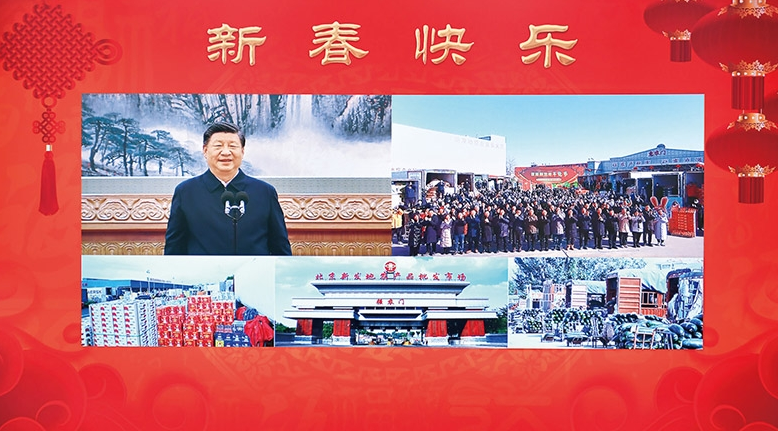 2023年1月18日,中共中央總書記、國家主席、中央軍委主席習近平在北京通過視頻連線看望慰問基層干部群眾,向全國各族人民致以新春的美好祝福。這是習近平通過視頻連線,同北京新發(fā)地農(nóng)產(chǎn)品批發(fā)市場的商戶和采購年貨的群眾親切交流。新華社記者 李濤/攝