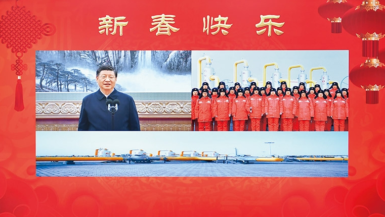 2023年1月18日,中共中央總書記、國家主席、中央軍委主席習近平在北京通過視頻連線看望慰問基層干部群眾,向全國各族人民致以新春的美好祝福。這是習近平通過視頻連線,同塔里木油田公司輪南油氣儲運中心西氣東輸?shù)?一站克拉集氣區(qū)員工親切交流。新華社記者 李濤/攝