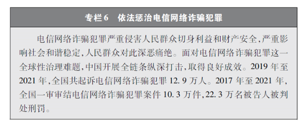 加大網(wǎng)絡(luò)犯罪懲治力度。隨著互聯(lián)網(wǎng)技術(shù)的快速發(fā)展,傳統(tǒng)犯罪加速向以互聯(lián)網(wǎng)為媒介的非接觸式犯罪轉(zhuǎn)變,電信網(wǎng)絡(luò)詐騙、網(wǎng)絡(luò)賭博、網(wǎng)絡(luò)淫穢色情等涉網(wǎng)違法犯罪多發(fā)。中國依法辦理新型網(wǎng)絡(luò)犯罪案件。連續(xù)多年開展“凈網(wǎng)行動”,嚴厲打擊群眾反映強烈的黑客攻擊破壞、侵犯公民個人信息等違法犯罪活動。持續(xù)推進“云劍”“斷卡”“斷流”“拔釘”等專項行動,打擊套路貸、校園貸、“以房養(yǎng)老”、“投資養(yǎng)老”等電信網(wǎng)絡(luò)詐騙犯罪,依法懲處為電信網(wǎng)絡(luò)詐騙犯罪團伙提供互聯(lián)網(wǎng)接入、域名注冊、服務(wù)器托管、移動互聯(lián)網(wǎng)應(yīng)用程序制作開發(fā)、網(wǎng)絡(luò)支付、引流推廣等服務(wù)支撐的黑灰產(chǎn)業(yè)。完善國家反詐大數(shù)據(jù)平臺和反詐移動互聯(lián)網(wǎng)應(yīng)用程序,建設(shè)國家涉詐黑樣本庫,完善快速止付凍結(jié)機制、涉詐資金返還機制。堅決打擊網(wǎng)絡(luò)賭博犯罪行為,從嚴治理網(wǎng)絡(luò)淫穢色情。網(wǎng)絡(luò)犯罪治理工作取得明顯成效,人民群眾安全感有效提升,社會更加和諧穩(wěn)定。