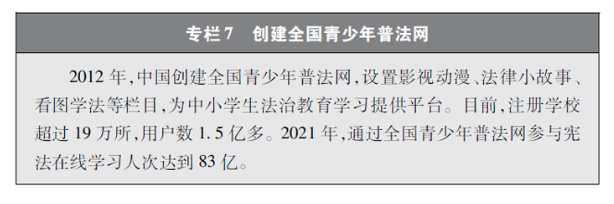 加強青少年網(wǎng)絡(luò)法治宣傳教育。青少年是祖國的未來、民族的希望。青少年網(wǎng)民在中國網(wǎng)民中的占比逐步增長。作為互聯(lián)網(wǎng)的“原住民”,青少年是網(wǎng)上學習、交流、生活最活躍的參與者、實踐者,其合法權(quán)益也更易受到網(wǎng)絡(luò)違法活動的侵害。中國從保護青少年網(wǎng)絡(luò)權(quán)益,促進青少年健康成長、全面發(fā)展出發(fā),遵循青少年身心發(fā)展規(guī)律,貼近青少年學習生活實際,聚焦網(wǎng)絡(luò)沉迷、網(wǎng)絡(luò)欺凌、網(wǎng)絡(luò)淫穢色情信息等重點問題,通過普法微綜藝、兒童普法話劇、網(wǎng)絡(luò)普法故事廣播、網(wǎng)絡(luò)普法云課堂、學法用法知識競賽、法治副校長進校園、編寫網(wǎng)絡(luò)普法讀本等生動活潑、豐富多彩的形式開展法治宣傳教育,逐步形成了政府、社會、學校、家庭相結(jié)合的法治宣傳教育格局,為提升青少年網(wǎng)民法治意識和網(wǎng)絡(luò)安全素養(yǎng)提供了全面保障。