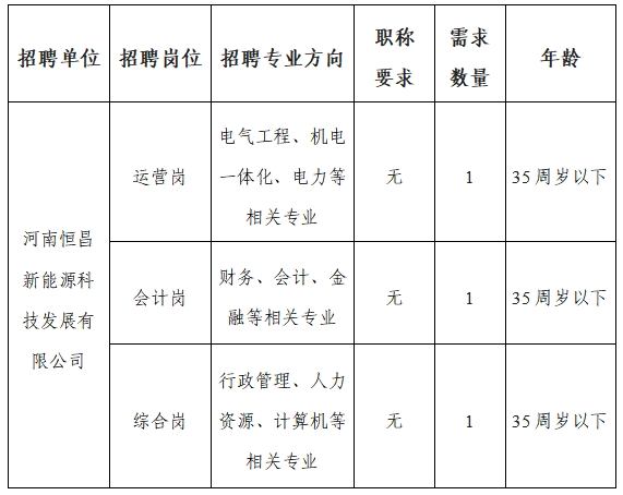 緩解河南恒昌新能源科技發(fā)展有限公司人才短缺狀況,結(jié)合公司經(jīng)營實(shí)際,現(xiàn)面向社會公開招聘專業(yè)人才3名?,F(xiàn)將有關(guān)事項公告如下: